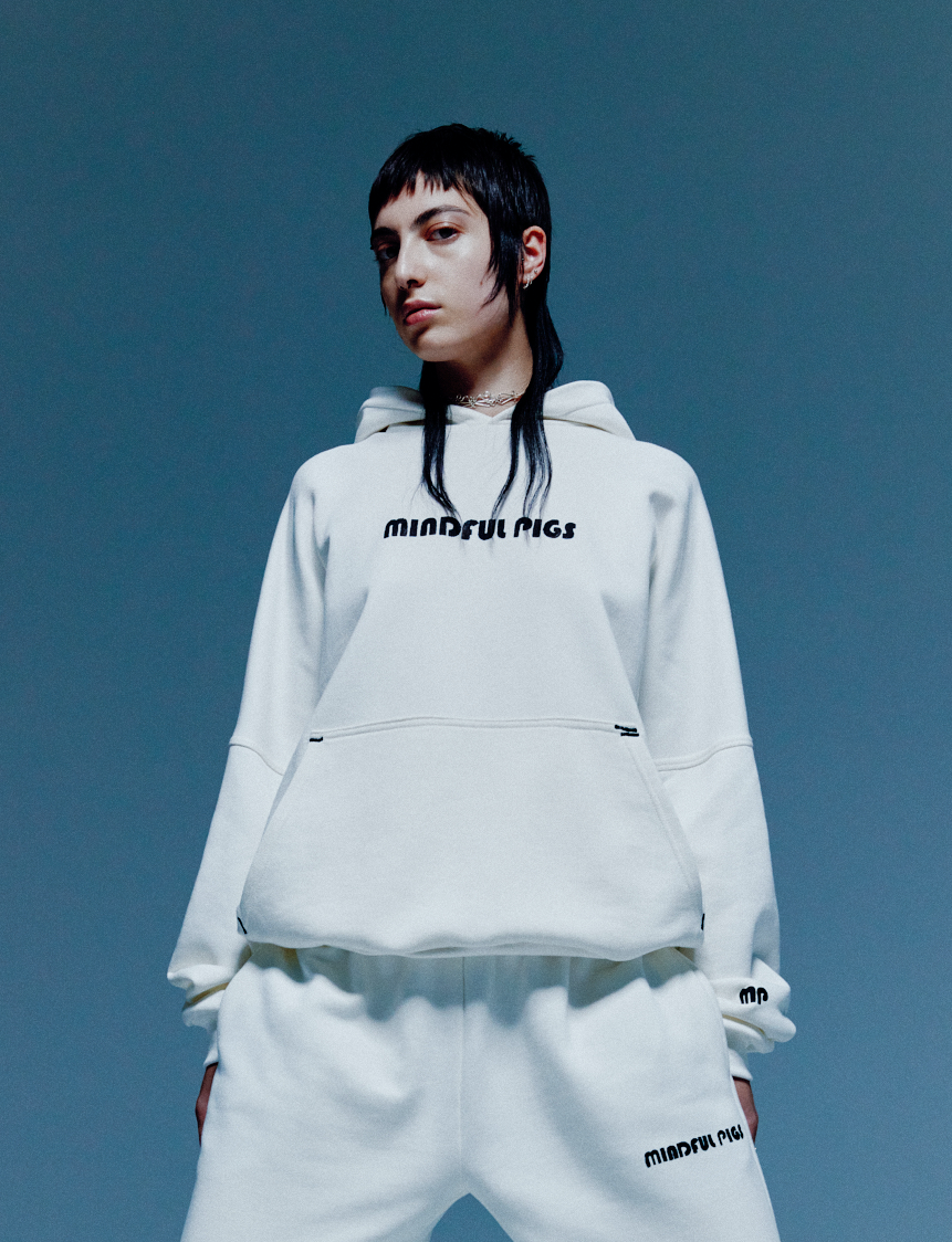 - MINDFUL PIGS peint à la main au centre de la poitrine, MP sur la manche gauche