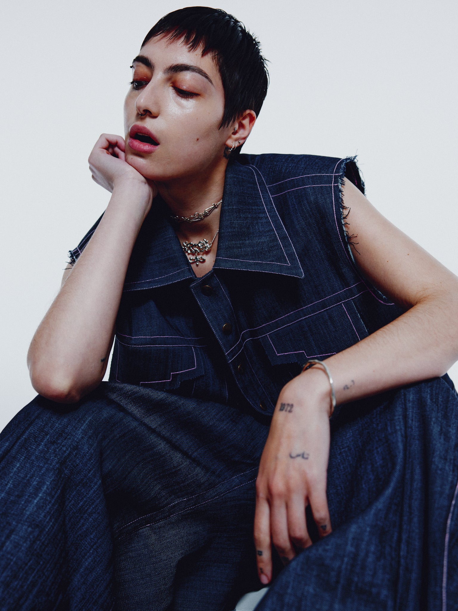 - Contrast topstitching in pink